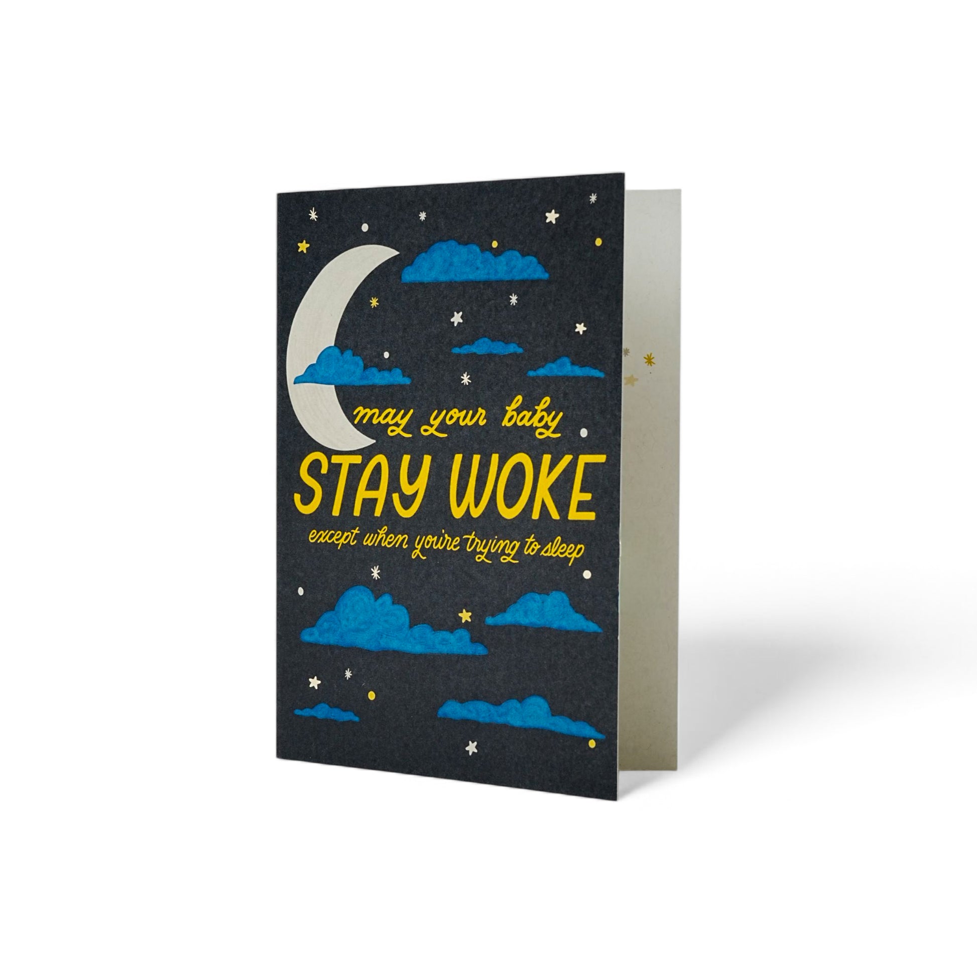 The Stay Woke Baby card, designed by Posterity Paper, offers a lighthearted yet thoughtful congratulations for welcoming a little one. Featuring a dreamy night-sky illustration with moon, clouds, and stars, the card reads: “May your baby stay woke — except when you’re trying to sleep.” It’s warm, witty, and perfect for celebrating new beginnings with a smile. Some messages balance joy and intention — this one does it beautifully.